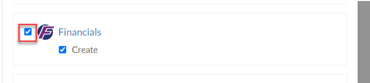 6. In the menu pane on the left of the dialog, select Apps. Tick the checkbox next to Financials.
