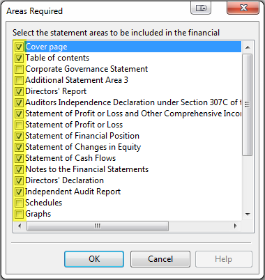 2. Tick the tickboxes next to the areas that you want inserted into the Financial Statements.