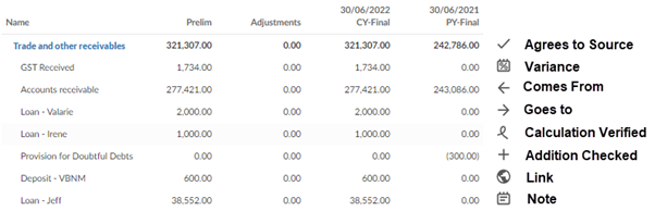 Purpose: The purpose annotation is used on audit work papers to denote auditing actions taken. These tick marks are useful from the audit manager’s perspective, to see which activities have been completed. The Variance tick mark will provide additional options to select either CY Prelim - PY Final or CY Final - PY Final.