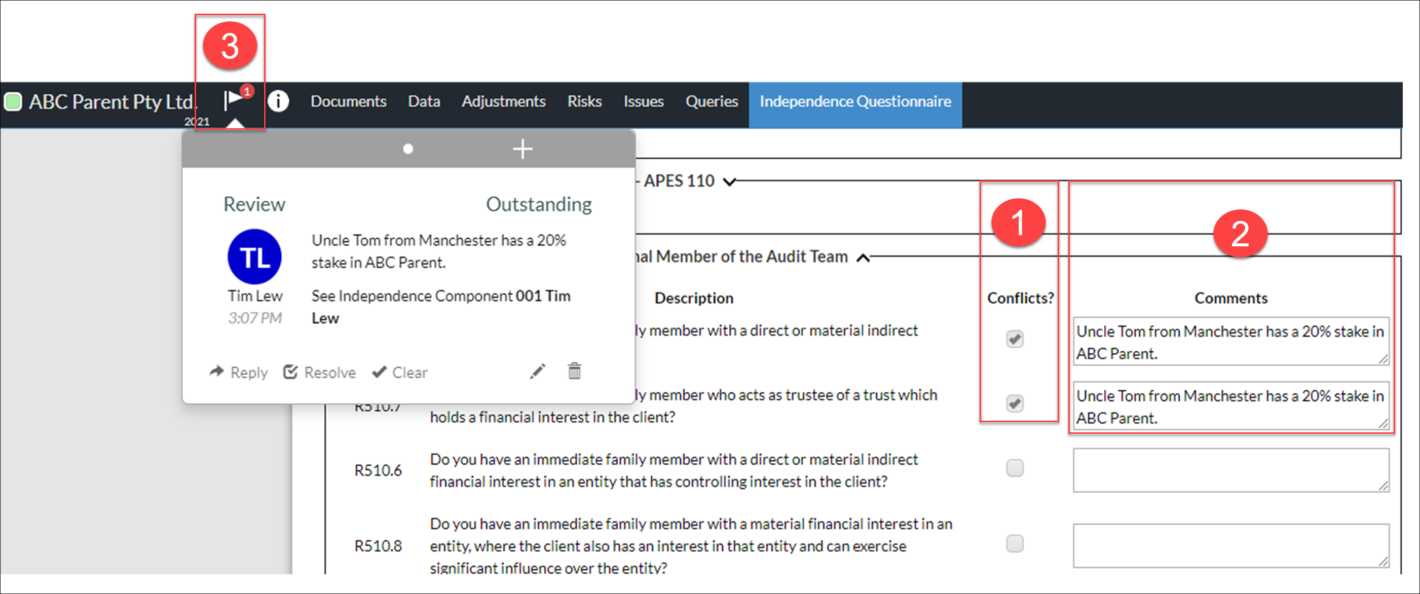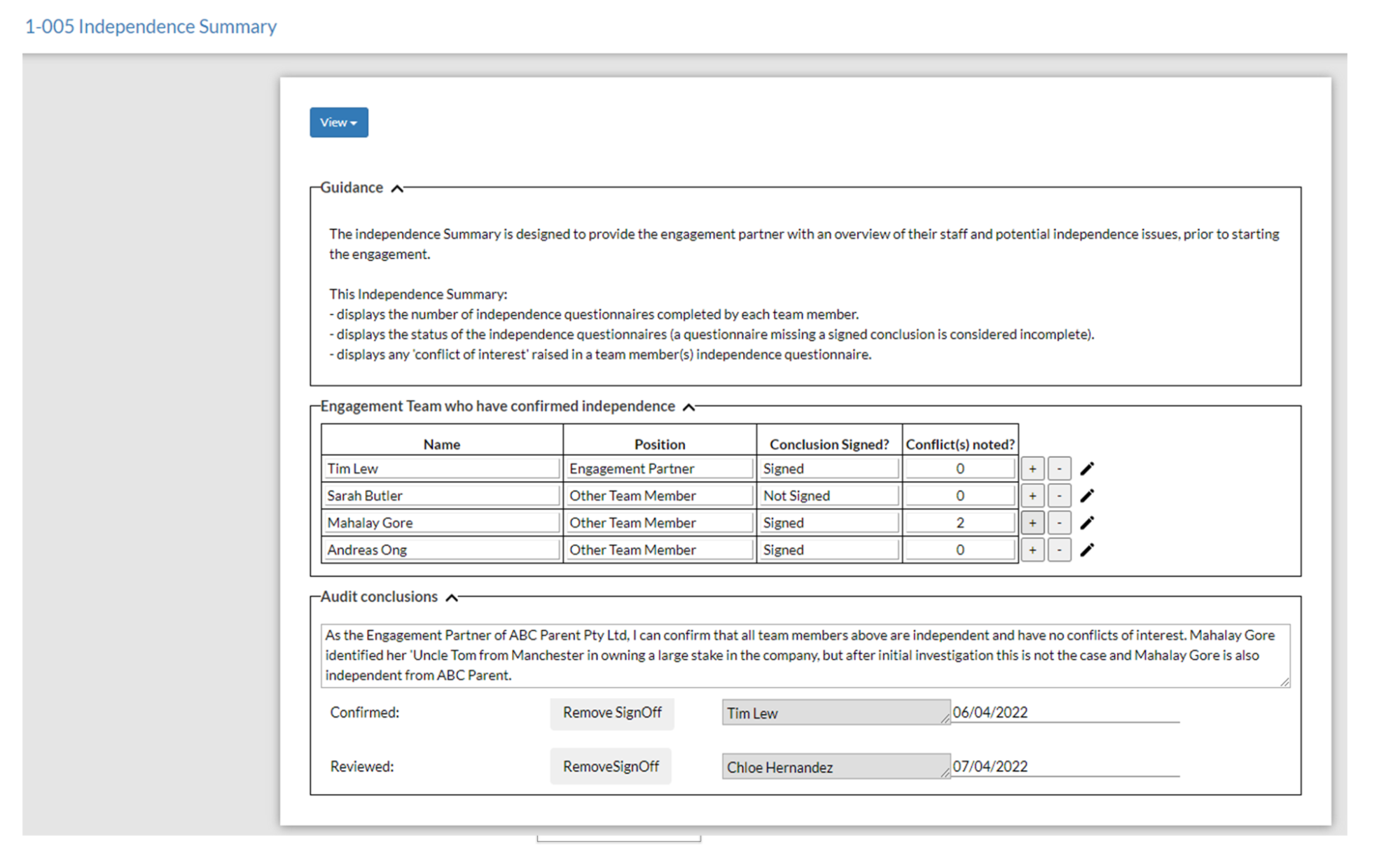 The Agile audit solution offers three independence workpapers which assist auditors with the application of the independence requirements of both the Corporations Act 2001 (if applicable) and APES 110 Code of Ethics for Professional Accountants.