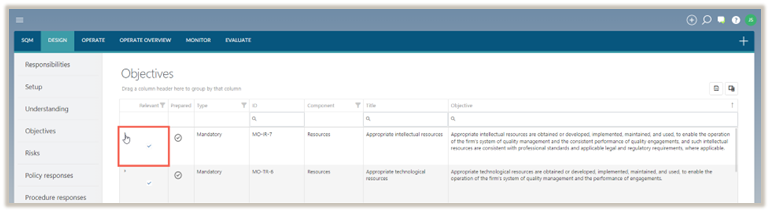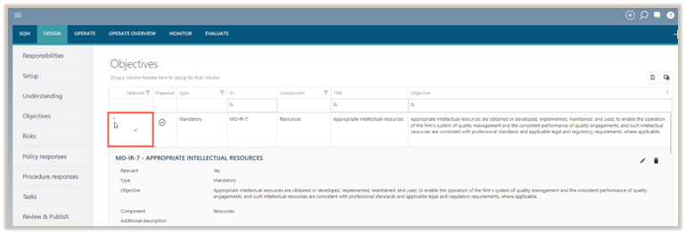 Relevant | Select either ‘yes’ or ‘no’. The default is ‘yes’, to indicate that the objective is relevant to the firm in compliance with the applicable quality management standard. |