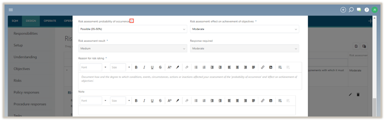 Reason for risk rating | In this field the firm documents how and the degree to which conditions, events, circumstances, actions or inactions affect the firm’s assessment of the ‘probability of occurrence’ and the ‘effect on the achievement of the quality objectives’. |