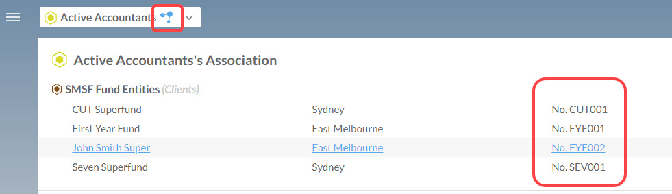 If you have used the Association feature in CaseWare Cloud to link funds with the relevant Accounting firm, select the Accounting firm in the entities list and then click the association button next to the entity name, to show all associated funds